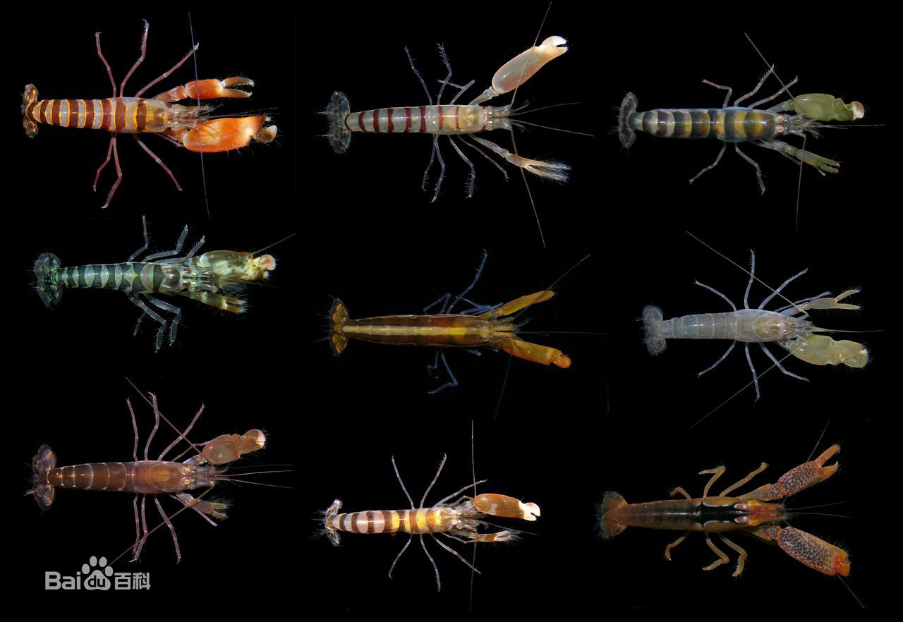 鼓虾科鼓虾属动物的统称。眼完全被头胸甲覆盖。第一对步足特别强大,钳状,左右不对称,雄性较雌性强大。生活时体上多具明显花纹,特别是鲜明鼓虾,体色鲜艳美丽。鼓虾的繁殖期在秋季,卵产出后抱于雌性腹肢间直到孵化。鼓虾遇敌时开闭大鳌之指,发出响声如小鼓,故称鼓虾。