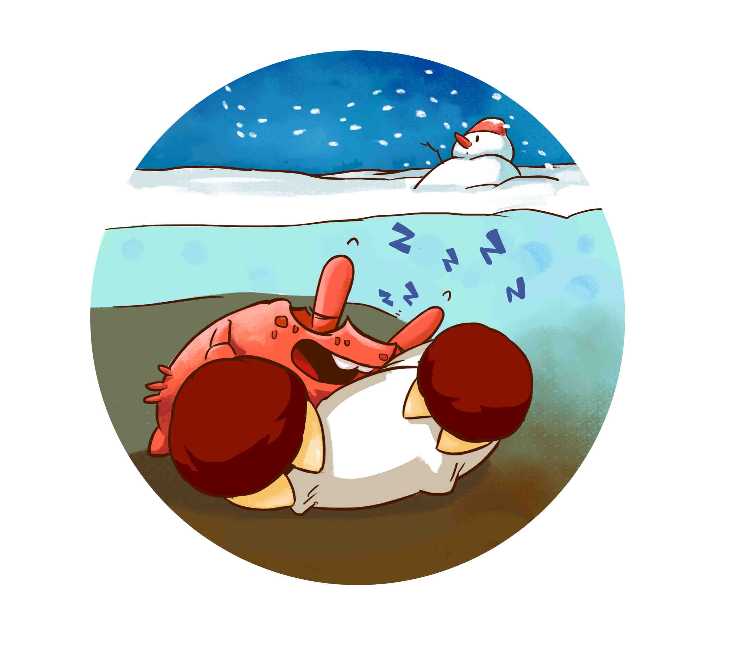 8.冬天时,天冷了,小河蟹们躲进水塘里,在厚厚的冰层下度过寒冷的冬天。