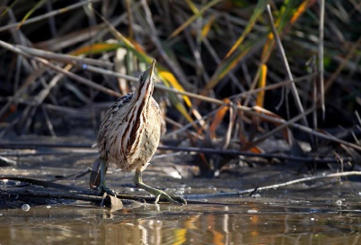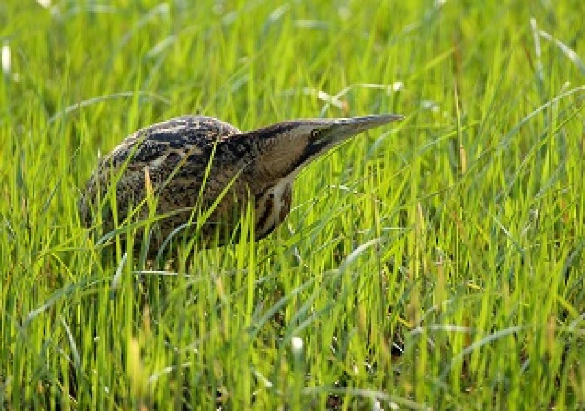 大麻鳽(学名:Botaurus stellaris),俗称:大水骆驼、蒲鸡、水母鸡、大麻鹭,是大型鹭类,体长59~77cm,全身为麻褐色,顶冠为黑褐色,头侧为金色,其余体羽多具黑色纵纹及杂斑。飞行时,具褐色横斑的飞羽与金色的覆羽及背部成对比。嘴为黄色,脚为绿黄色。看看这身行头,像不像草莽英雄——如果不仔细看,它们与枯草混在一起,加之它们懒得动,根本发现不了“目标”。这大概是它们自我保护的一种“策略”吧。