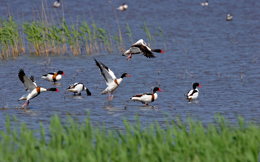 翘鼻麻鸭,又名:白鸭、冠鸭、掘穴鸭、潦鸭、翘鼻鸭、花凫。体长约60cm,身体颜色非常醒目。翘鼻麻鸭雄鸟的头部和上颈为黑褐色,具有绿色的光泽。体羽主要为白色。喙为赤红色,基部生有一个突出的红色皮质瘤,颜色艳丽,是野鸭族群中最漂亮的一种。特别是它们微微上翘的红嘴,使它们看起来像涂了个性口红的大嘴名星,又像谁家朴拙而讷于言的乖娃娃,憨乎乎的,特别惹人喜爱。其实,它们机灵着呢。