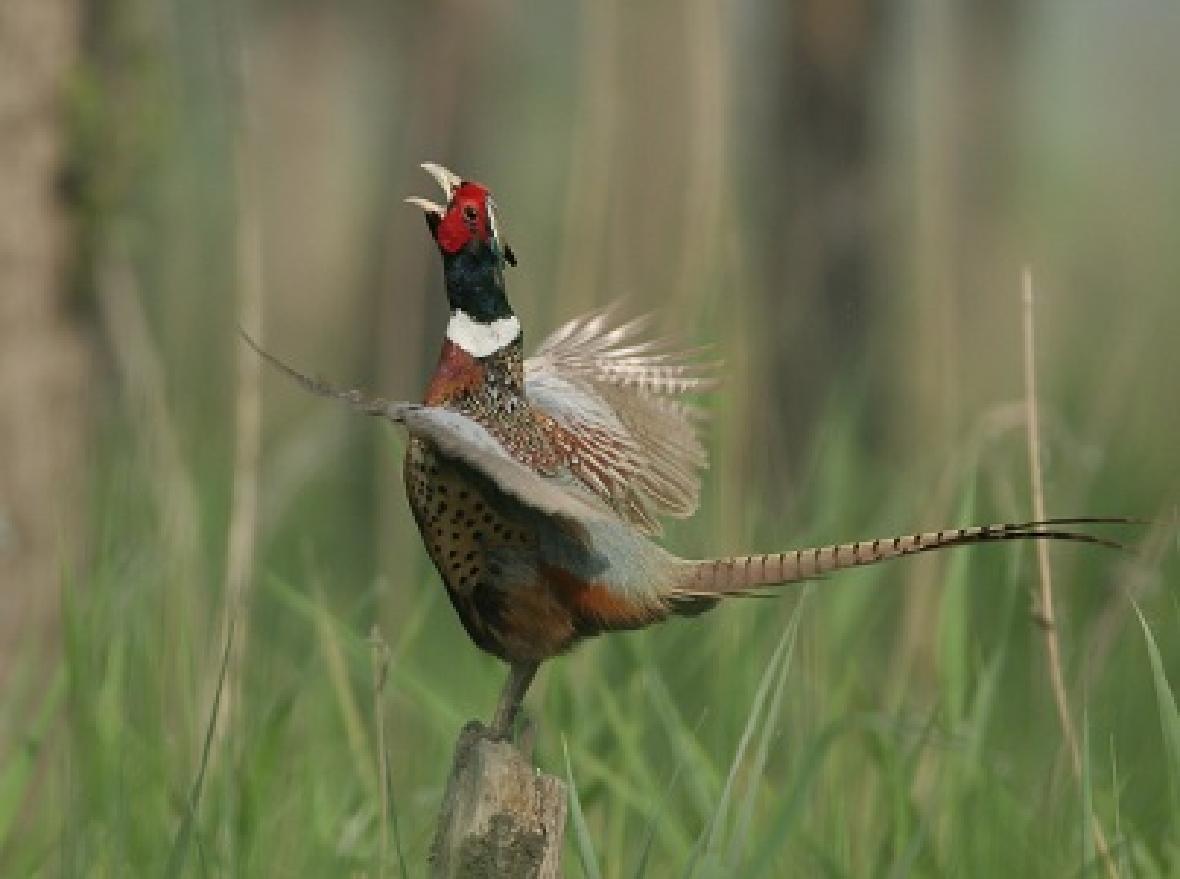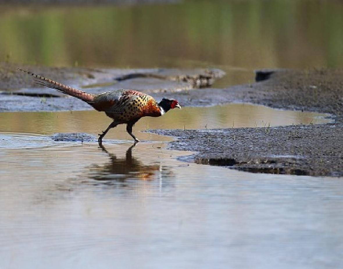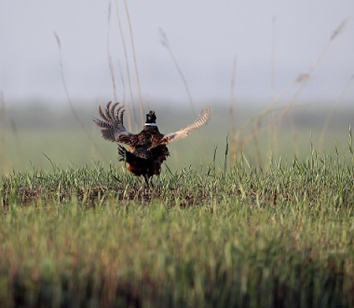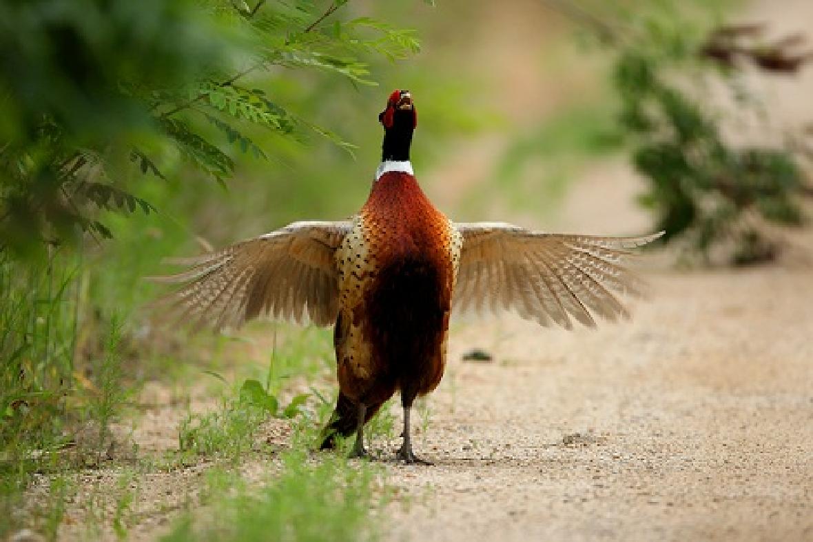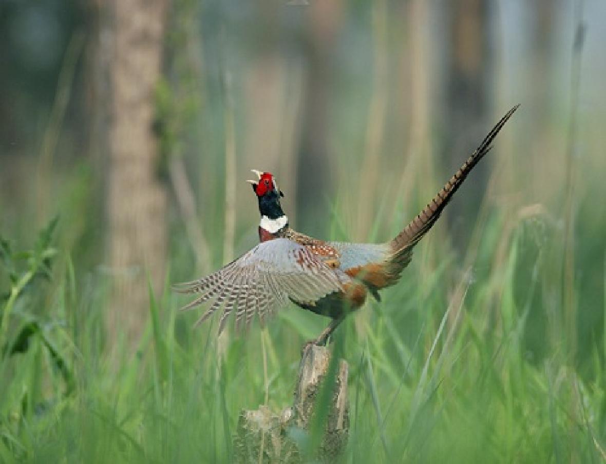环颈雉栖息于开阔的林地、灌木丛或农耕地。它们喜欢闲散地散步或扎在草堆里不动,虽属鸟类,除非万不得已,它们是不飞的,更不会游泳,是真正的“旱鸭子”。如遇紧急情况,它们也只不过飞出区区百八十米——准确地说,也不叫“飞”,只能叫“超低空滑翔”。