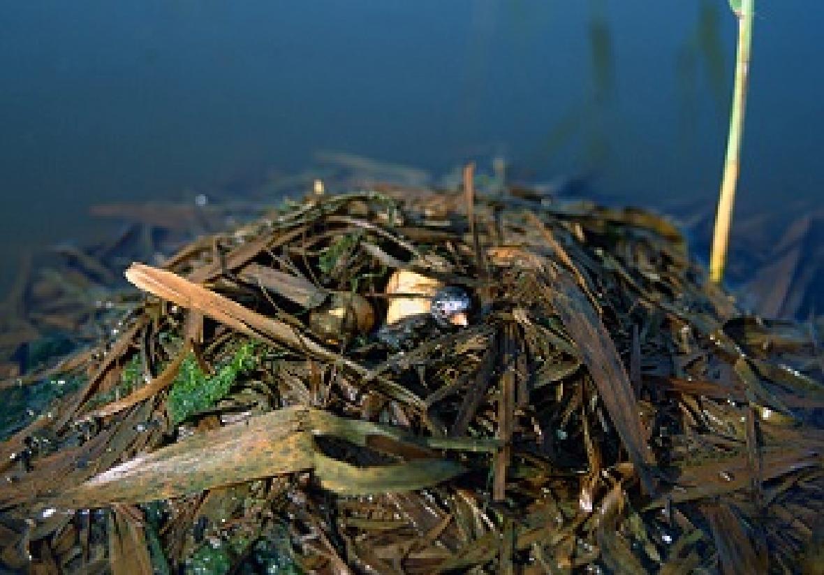 在一个繁殖期,一般产卵5~6只。因水阻隔,我看不到那只巢里究竟有几只蛋。但是,从那只蛋所处的高度来看,巢里面还有蛋是肯定的。