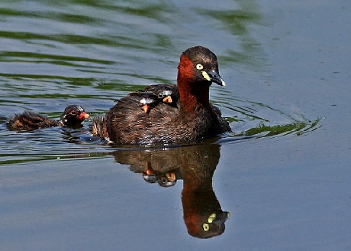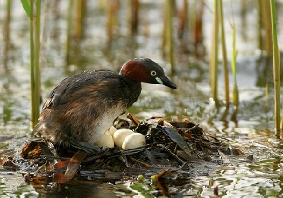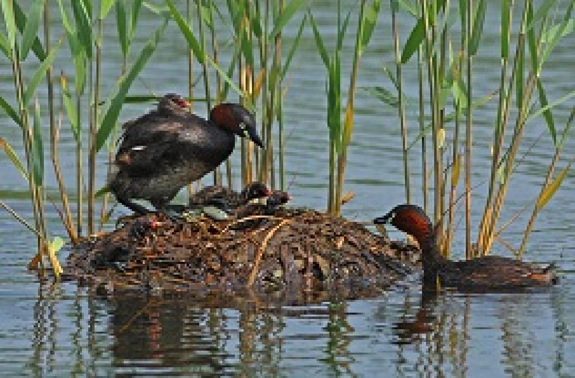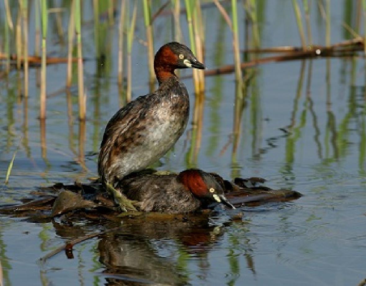 夫妻恋爱期间形影不离。进入孵化期后,它们分工明确,轮流进行孵化。小䴙䴘 的幼雏出壳后,小鷉夫妻一个负责四处捕食,喂养爱子;一个负责驮着幼雏在芦荡中玩耍,遇到紧急情况,快速潜水或进入芦荡深处躲避起来。然后,离开旧巢,不再回来。