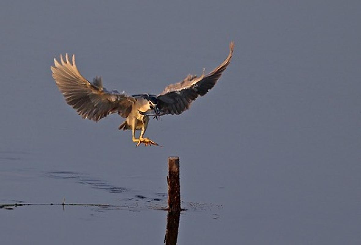 夜鹭捕鱼的方法很有特点。对于较小的鱼来说,它们会用尖尖的、硬硬的上、下喙紧紧夹住。对于稍大一点儿的鱼,它们则会利用上喙先刺透鱼的身体,并同时用上、下喙合拢,牢牢夹住猎物。夜鹭的眼睛有特异功能。每次捕鱼时,头入水的一刹那,它们眼睛的瞬膜(第三眼睑)便迅速遮住双眼,以避免遭到意外伤害和水的污染。出水后,瞬膜则立刻收回,以恢复正常情况下的良好视力。