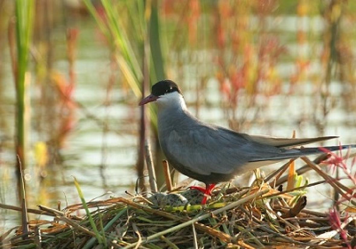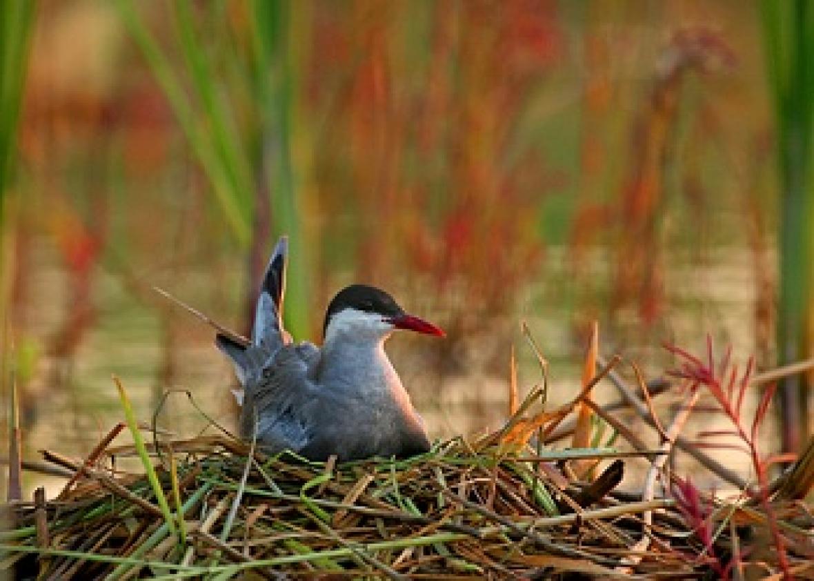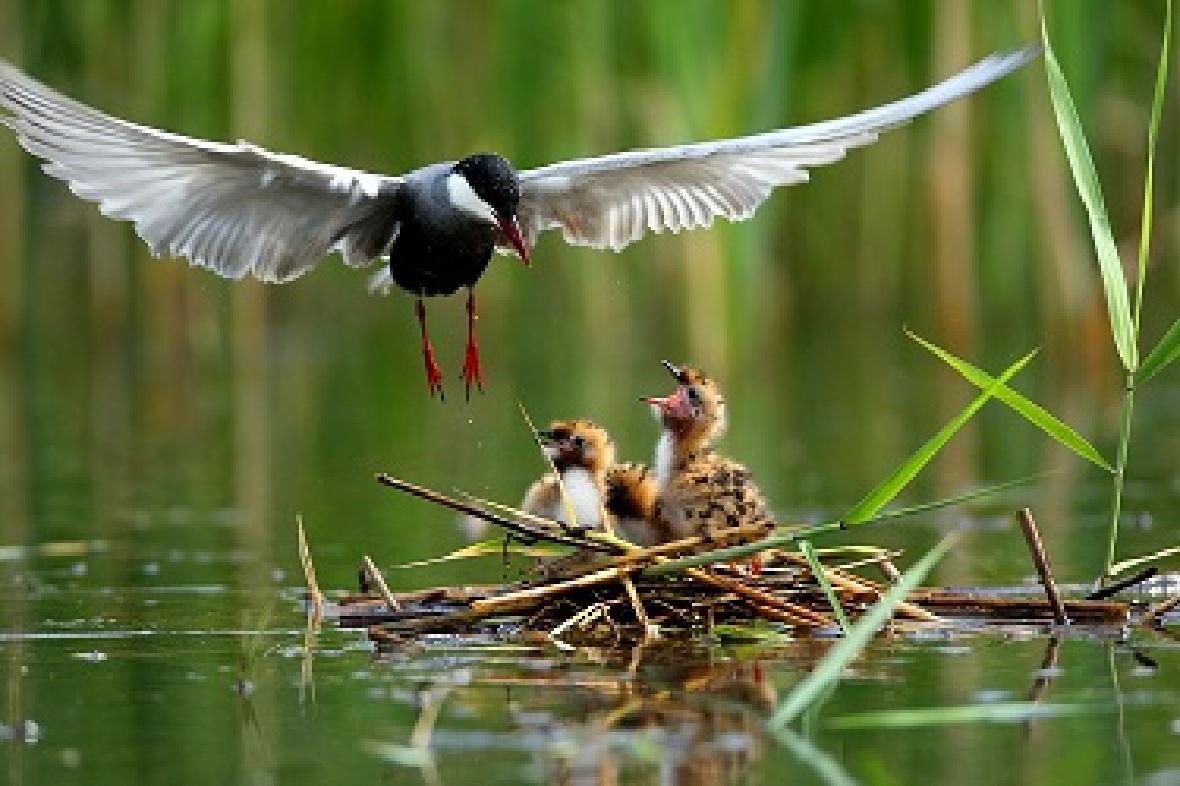 那天,我们本意是去拍戴胜的巢,无意间看到迎面飞来的须浮鸥,一只又一只——附近一定有须浮鸥的巢!果然!不远处,有四五十只须浮鸥在水面上下翻飞。水面四周,足有一米多高的芦苇形成密闭的环状,营造出一个安谧之所,像神秘的四合院。须浮鸥正在各自的巢上安歇:有的在专心致志孵化;有的衔枝补巢;有的在戏水游玩;有的觅食归来,为兢兢业业伏在蛋上“值班”的“爱侣”送来鲜美的餐食……