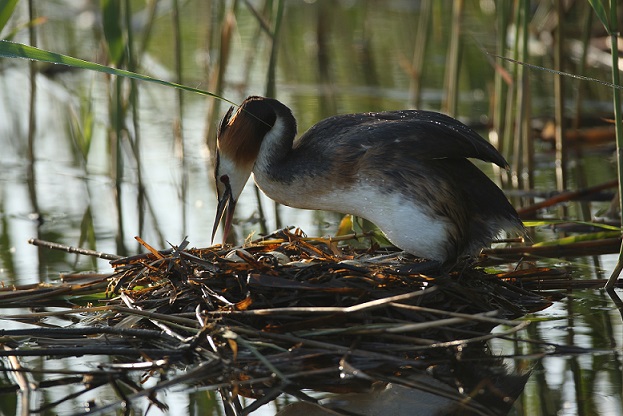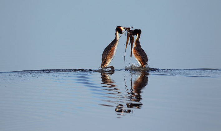 当雌、雄“凤头”双方彼此相悦时,它们会立刻展示出各自美丽的一面——在水中,它们头顶和胸部的羽毛光亮而鲜润地全部打开,双方深情凝视,摇头晃脑,幽默而滑稽。情到深处,它们还会摆出各种“pose”吸引对方。舞到高兴时,它们还会跳起激情四射的舞蹈,并一起潜入水中,搅得水花激荡,四处飞溅。转瞬间,只见它们不知从哪儿弄来一把湿湿的干枯水草,各自把水草叼在嘴中,作为献给心仪恋人的礼物。“疾风暴雨”过后,它们便双双返回爱巢……