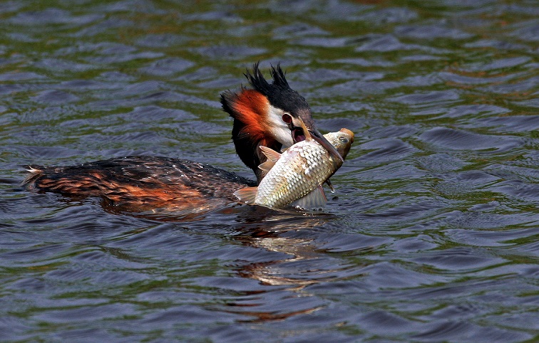 凤头鷉多见于湿地的池塘、苇丛之中,那里丰富的鱼、虾资源,可以让它们痛痛快快地随时饱餐。我曾亲见凤头鷉与一条红尾鲤鱼交锋,凤头鷉用细长的喙横着紧紧夹住红尾鲤鱼。虽然鲤鱼很大,但是,近半个小时的搏斗,“凤头”最终还是置鲤鱼于死地。凤头鷉捕鱼、游泳、潜水,技艺超群。