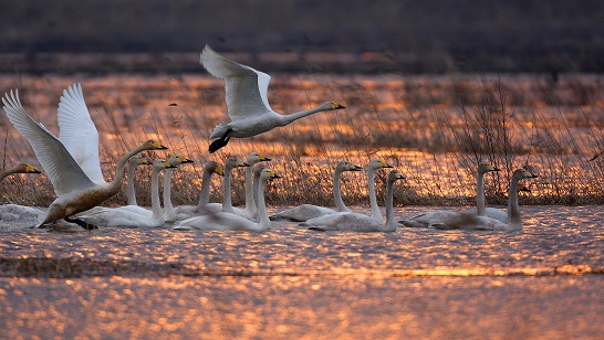 Every spring, the whooper Swan migrates to north from Rongcheng, Shandong, staying at the Liaohekou wetland for about a month, and then continue to fly to Inner Mongolia. They have safe conscious and collective concept, they rarely stay on land, but landed on the wider water surface of the reed,they will be together to take care of each other at rest time in the evening.They also pay special attention to democracy, before flying and landing,their "leader" will ask them for advice.